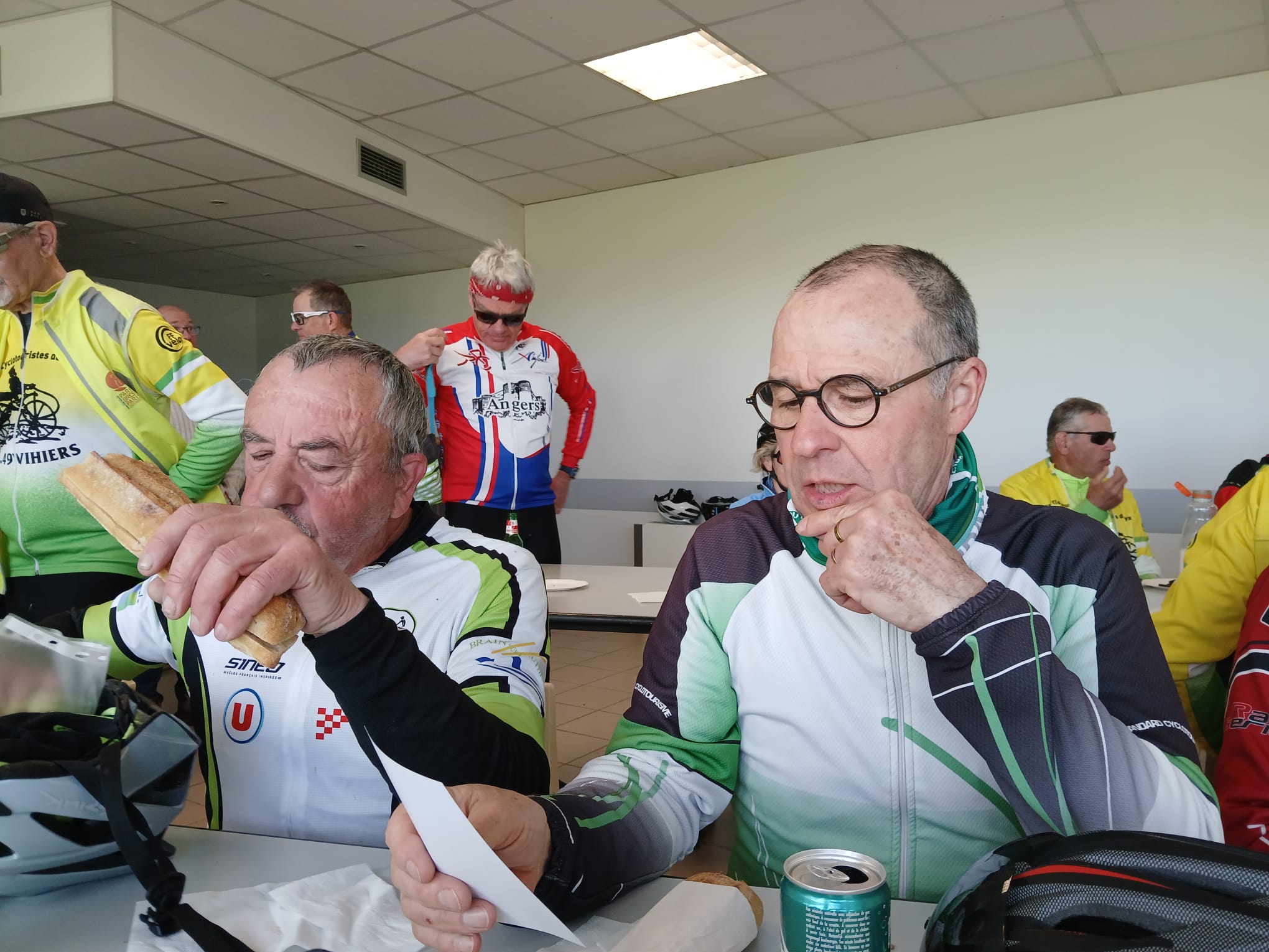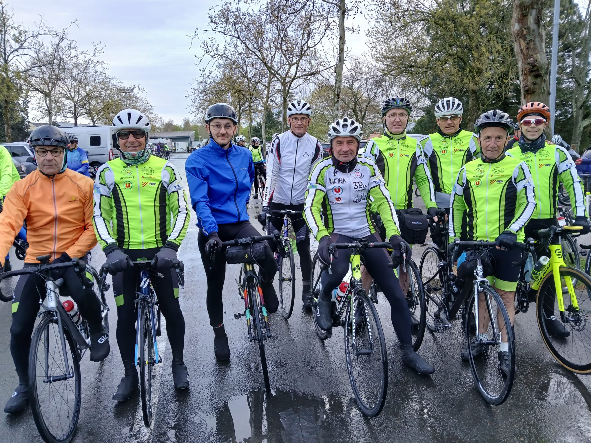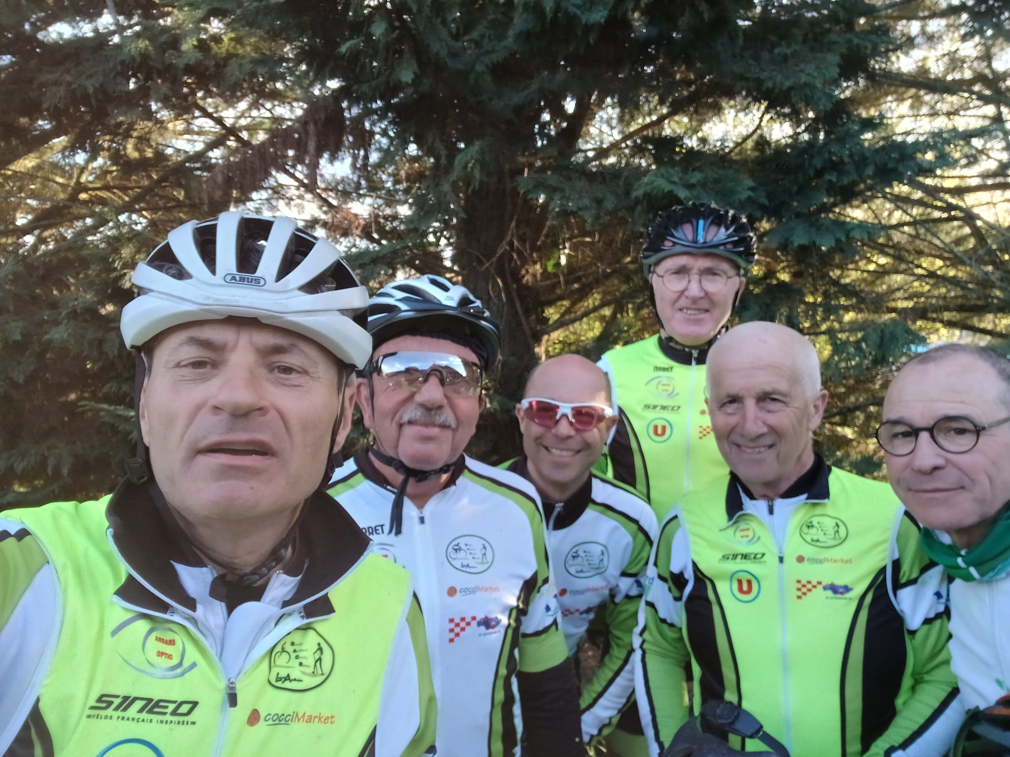 Didier, chaud bouillant, est parti avec la 1ère vague et réalise une très belle performance (30 km/h de moyenne) , Richard, Eric L.,Hugo et Pierre-Yves sont arrivés peu après, quand Bruno et moi avons sagement accompagné nos petits nouveaux Eric H. et Pascal B .Seul JP N n’a pu rejoindre l’arrivée, victime d’un pneu éclaté à 15 kms du but ...Bref , une belle réussite !